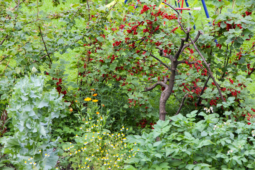 Tale krompir se je ravil iz lanskih pozabljenih. Skupaj z vse bolj rdečim ribezom ustvarijata prav lepo tihožitje.